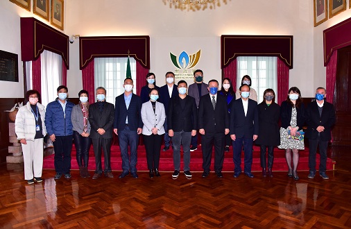 2022年1月12日,澳门中小企业发展联盟理事长胡达忠及监事长马建章等一行,拜访市政署,市政管理委员会主席戴祖义、副主席柯岚、市政管理委员会委员吴秀虹、杜淑仪等出席。